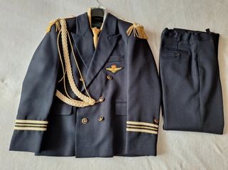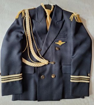 Traje de comunión para niño, talla 8. Compuesto por chaqueta y pantalón. - Chaqueta azul marino de doble abotonadura. - Hombreras doradas con cordón trenzado. - Insignia dorada con corona y alas en la solapa. - Puños de la chaqueta con detalles dorados. - Pantalón azul marino con cintura elástica.