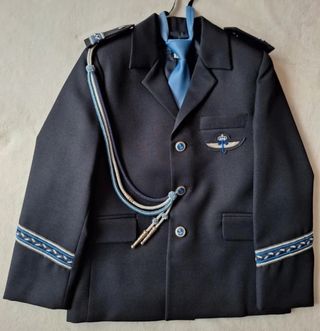 Traje de comunión para niño con temática de Policía Nacional. - Talla 12. - Incluye chaqueta y pantalón. - Detalles dorados en cuello, puños y hombros. - Adorno de cordón dorado en el pecho.