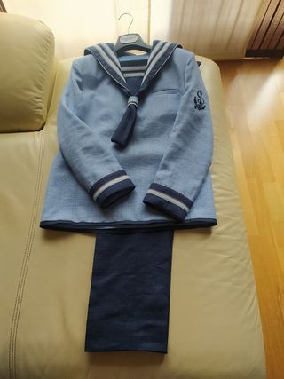 Traje marinero primera comunión, del Corte Inglés. Talla 8, usado una vez y limpio. De poliéster 100%, Medidas chaqueta: ancho de hombros 37cm, largo total 53cm, largo de manga 44cm. Tiene dos bolsillos. Medidas pantalón: contorno cintura 56cm (tiene goma atrás), largo total 79cm.