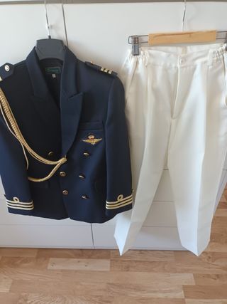 Traje de almirante de la marca Novadrima, se compone de pantalón azul marino, camisa blanca del corte inglés, chaleco y chaqueta cuello mao. Talla 8. Està impecable. Tengo los zapatos usados solo de ese día unas horas n37 (12€ más) si se quieren.