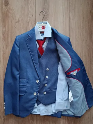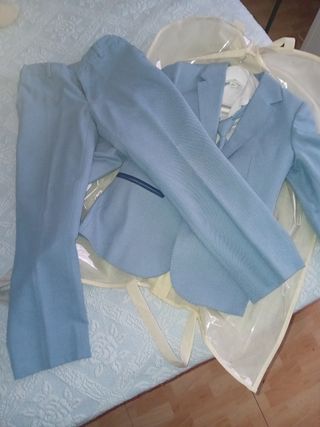 Traje color azul cielo que incluye pantalón, americana, chaleco, camisa blanca manga larga y corbata. Talla 11. Usado solo para el día de la comunión y después lavado en tintorería.