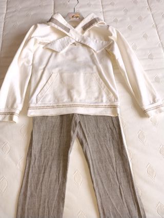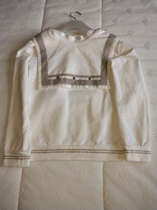 Conjunto de dos piezas para comunión con diseño marinero. Incluye sudadera y pantalón. - Sudadera blanca con detalles marineros. - Pantalón de lino color beige. -Contacto por WhatsApp. - Recogida en Zaragoza.