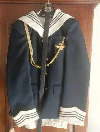 Traje de comunión estilo marinero, talla 10. Incluye chaqueta y pantalón. - Chaqueta azul marino con detalles dorados. - Hombreras y cordones decorativos dorados. - Insignia bordada en el pecho. - Puños con galones dorados. - Cierre de doble abotonadura con botones dorados.
