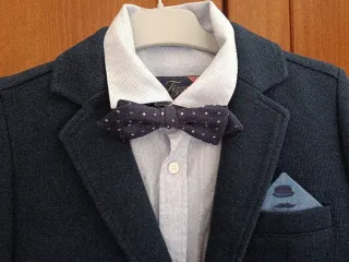Conjunto de traje para niño, ideal para comuniones u ocasiones especiales. Incluye chaqueta, camisa, pajarita y pañuelo. - Chaqueta azul marino. - Camisa azul claro con microestampado. - Camisa azul lisa - Pajarita azul marino con topos blancos. - Pañuelo de bolsillo azul con diseño de sombrero y bigote.
