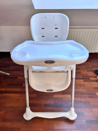 Trona de bebé de la marca Brevi, en color blanco. - Cojín acolchado para mayor comodidad. - Bandeja extraíble. - Reposapiés. - Plegable para un fácil almacenamiento. - Sin tirantes