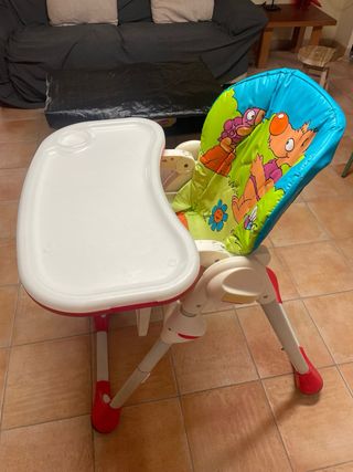 Trona de la marca Chicco - Con 2 fundas alcolchadas. - Altura regulable 5 posiciones. - Respaldo reclinable 3 posiciones. - Reposapies extraíble con 3 alturas y 3 inclinaciones. - Bandeja extraíble. - Patas ajustables con ruedas. - Los brazos se levantan. - Funciona perfectamente. - Ojo! Hay una pequeña raja en la funda exterior.