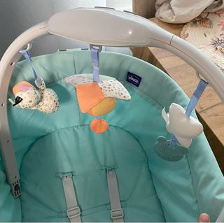 Mecedora / amaca, para bebés de la marca Chicco, en tonos verde y blanco. Tiene sonido y funciona perfectamente. Entrega en mano en Alcalá de Henares.