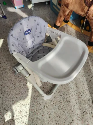 Trona de bebé de la marca Chicco en color gris. Perfecta para las comidas de los más pequeños. - Asiento acolchado. - Arnés de seguridad de 5 puntos. - Bandeja extraíble. - plegable - fácil de guardar. Funciona perfectamente pero presenta signos evidentes de desgaste en la funda. Se puedo comprar una funda en Amazon por solo 30€.