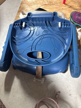 Trona portátil de viaje de la marca Chicco. Con bandeja de tamaño configurable y con arneses de seguridad, tanto para sujetar la trona a una silla, y al bebé en la trona. Está perfecto, como nuevo!