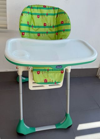 Trona Chicco Polly en color verde y blanco con un divertido estampado. - Asiento acolchado. - Bandeja extraíble. - Cesta para accesorios. Las fundas están rajadas por meterlas en la lavadora
