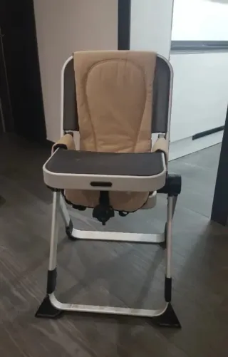 Trona ligera y fácil de plegar (no ocupa nada, como se ve en las fotos). - No tiene bandeja porque se rompió un enganche pero la he estado utilizando como silla para comer el niñ@ en la mesa con los demás. - Se ajusta a la altura necesaria desde las pestañas de las patas. - Estructura de aluminio. - Funda negra acolchada. - Arnés de seguridad. - Incluye reposapiés plegable debajo del asiento