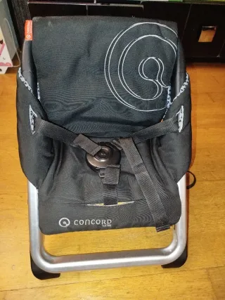 Práctica trona de viaje de la marca Concord. Es ligera y fácil de transportar, ideal para llevar a cualquier parte.le falta la bandeja de comer, - Diseño plegable. - Estructura metálica. - Arnés de seguridad.