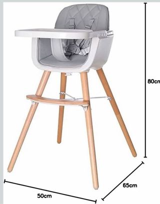 Trona de bebé con un diseño moderno y funcional. Combina patas de madera natural con un asiento acolchado en gris. - Altura total: 80cm - Ancho: 65cm - Profundidad: 50cm