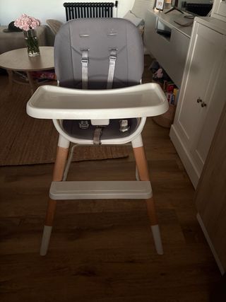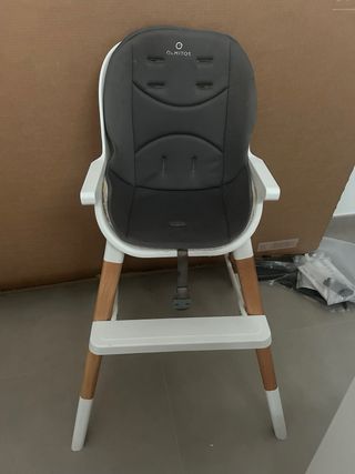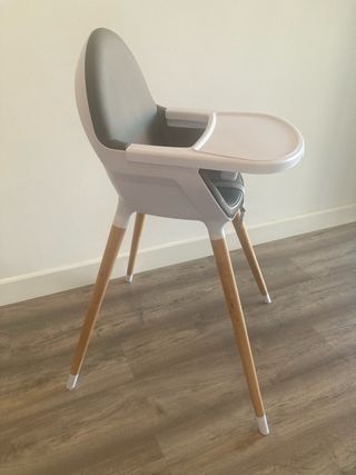 Trona de la marca Olmitos, con un diseño moderno y funcional. - Patas de madera. - Reposapiés. Le falta la bandeja y tiene un pequeño desperfecto en el reposapiés. Está reparado y no afecta a su estructura.
