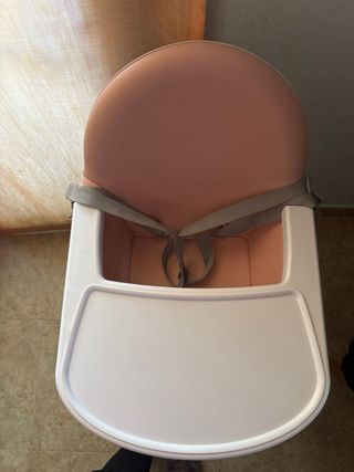 Trona Olmitos en color rosa y blanco. Se encuentra completa y lista para su uso. - Incluye las patas de madera. - Incluye la bandeja. - Incluye el arnés de seguridad.