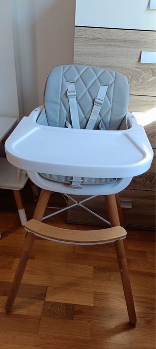 Silla de comer para bebé con diseño moderno y patas de madera. - Asiento acolchado. - Bandeja desmontable. - Cinturón de seguridad de 5 puntos. - Portavasos integrados. - se puede hacer dos partes y se quedaría una silla más baja y una mesa