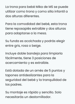 Trona infantil con un diseño moderno y funcional. - Asiento confortable, suave al contacto y fácil de limpiar. - Alta seguridad con su cinturón de 5 puntos. - Patas en madera de haya que se pueden desmontar para convertirla en trona de menor altura. - El reposapies se puede quitar fácilmente. - Estructura del asiento en polietileno. - Asiento en poliéster. - Alto de trona 96 cm. - Alto de silla 72 cm. - Se puede usar desde los 6 meses hasta los 36 aproximadamente (o 15kg)