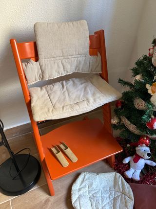 Trona Stokke en color naranja, ideal para que los más pequeños coman cómodamente. Incluye cojines. - Cojín de asiento. - Cojín de respaldo. - Dos piezas de madera para el asiento.