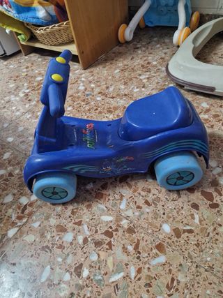 Tacatá de color azul para bebés, con asiento estampado de coches. - Estructura de plástico resistente. - Asiento acolchado - El sonido no funciona.