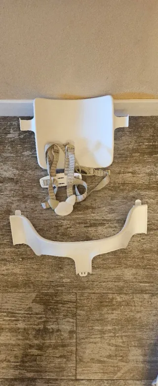 Accesorios para silla Stokke. - Respaldo de plástico blanco. - Barra frontal de plástico blanco. - Arnés de seguridad con correas. - Prácticamente sin uso. - Con su caja original