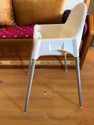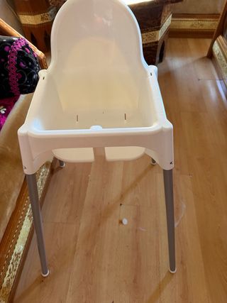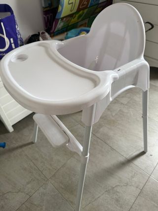 Trona de la marca IKEA, ideal para los más pequeños. Su diseño es sencillo y funcional. - Material de plástico blanco. - Patas grises extraibles - Arnés de seguridad.