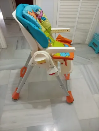 Doy por gratis una silla de bebé con asiento acolchado y bandeja. - Asiento acolchado con estampado. - Bandeja de plástico azul. - Arnés de seguridad.