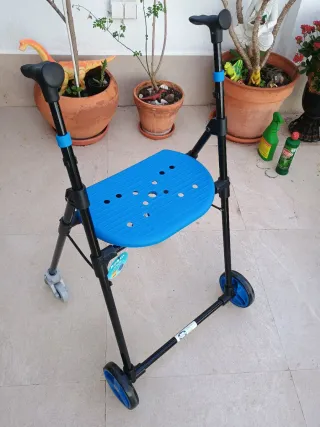 Andador ligero con asiento azul, ideal para facilitar la movilidad. - Estructura de metal negro. - Asiento de plástico azul. - Ruedas para desplazamiento. Acepto bici de paseo, carreras o carretera, fixie, como parte de pago o posible cambio.