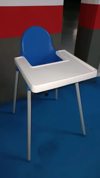 Trona de la marca Ikea, ideal para las comidas de los más pequeños. Su diseño es práctico y funcional. - Bandeja de plástico. - Patas metálicas.