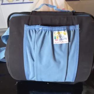Trona portátil de la marca The First Years, ideal para llevar a cualquier parte. Diseñada para la comodidad y seguridad del bebé. - Color principal . azul marino. - Bolsillo frontal de tela azul. - Correas de sujeción azules.