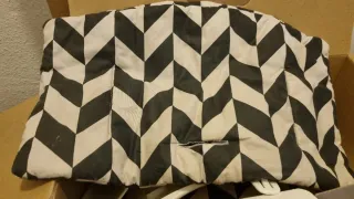 Funda y cojín para trona Ikea. - Funda de tela blanca acolchada. - Cojín interior con estampado de espigas en gris. - Cierre de cremallera amarilla. - Botones a presión en la funda.