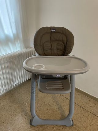 Trona Chicco Polly Magic Relax en color gris. - Asiento acolchado. - Bandeja extraíble. - Reposapiés ajustable. - Ruedas para facilitar el movimiento. Esta completo , tiene el arco de juego y un colchado de tela color beige para mas comodidad