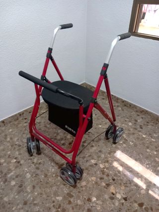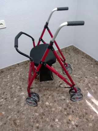 Andador de color rojo con asiento incorporado y ruedas para facilitar el desplazamiento. - Estructura metálica. - Asiento de tela. - Ruedas delanteras.