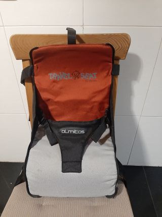 Trona de viaje plegable de la marca Olmitos. Es compacta y fácil de transportar. Se fija con correas al respaldo y al asiento de la silla. Recogida zona metro arturo soria. Será preciso lavarla, la funda es desmontable.