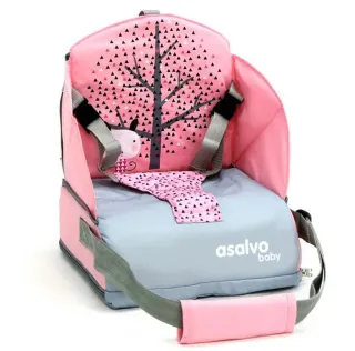 Trona portátil de la marca Asalvo, ideal para llevar de viaje. Rosa. Con cinta para colgar. Se pliega. Bolsillo delantero. Arnés con 3 puntos de sujeción. No pesa