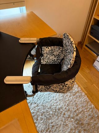Trona de viaje para bebé, fácil de transportar y guardar. - Diseño plegable. - Acolchado para mayor comodidad. - Estampado floral en blanco y negro. Precio no negociable. Trato en mano. Recogida en S. S. Reyes (Madrid)