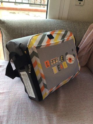 Trona de viaje con un divertido estampado de ositos y abejas. Muy buen estado. - Diseño compacto y portátil. - Tejido lavable y fácil de limpiar. - Incluye cinturón de seguridad. - Incluye compartimento para guardar tupper, bolsas, o cualquier cosa que se necesite.