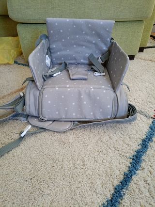 Ideal para viajes o transición del niño cuando son pequeños para la sillas y grandes para las tronas cuenta con cambiador multitud de bolsillos para llevar lo necesario para el niño ,no ha tenido nada de uso fue un regalo y teníamos otra . No leer salvo,choco,jane ,inglesina ,trona ,