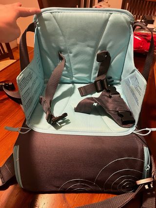 trona de viaje para poner en una silla. Se ata con sus cierres. Es plegable para que no ocupe. se le ha ido un poco el dibujos, y por un lado un poco descosida por eso el precio.