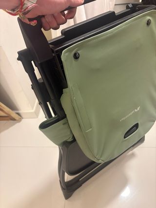 Trona portátil de la marca In The Pocket Baby. Es compacta y fácil de llevar. Lo mas practico para salidas, viajes o escapadas. - Color verde. - Etiqueta con el nombre de la marca.