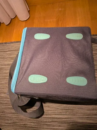 Trona de viaje portátil en color azul, ideal para llevar a cualquier parte. Se pliega fácilmente para su transporte. - Correas de sujeción ajustables. - Compartimento interior. - Cierre de seguridad. - lavable en lavadora quitando las cremalleras - Hago envíos
