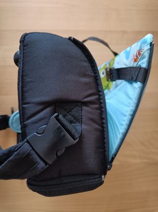 Preciosa trona de viaje para bebé, ideal para llevar a cualquier parte. Está en muy buen estado y lista para usar. - Diseño ligero y plegable para facilitar el transporte y almacenamiento. - Tejido suave y acolchado para mayor comodidad del bebé. - Incluye arnés de seguridad, asa de transporte, dos compartimentos laterales isotérmicos así como una nevera que se guarda en la parte inferior del asiento.