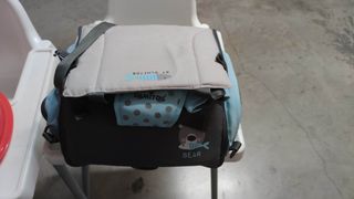 Trona de viaje con almacenaje. Desmontable y fácil de llevar como bolso. Ocupa poco espacio, muy práctico incluso para llevarlo en el maletero del coche. En perfecto estado.
