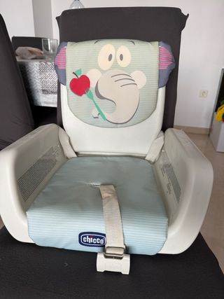 Práctica trona de viaje Chicco con un simpático diseño de elefante. - Cojín con estampado de rayas celestes. - Respaldo con dibujo de elefante. - Marca Chicco.