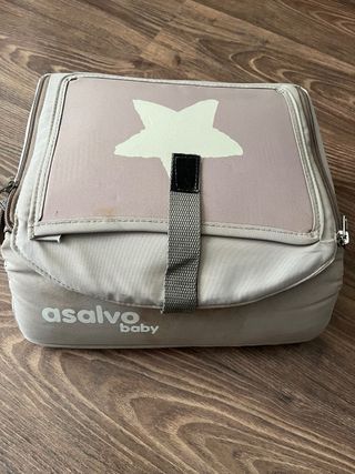 Bolso y trona de viaje, dos en uno. Con múltiples compartimentos. Muy útil, llevamos una siempre en el coche o de viaje. Tiene un uso (nos regalaron dos).