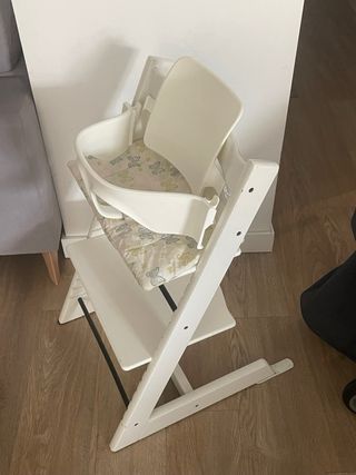 Trona evolutiva de la marca Stokke + cojín de regalo. Color rosa palo. En buenas condiciones, con marcas de uso (como se ve en las fotos). Ajustable tanto la base del asiento como el reposapiés.