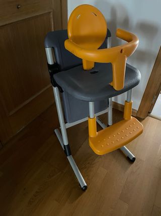 Trona evolutiva de madera, ideal para que los más pequeños se sienten a la mesa con autonomía. - Diseño tipo Montessori. - Asiento y reposapiés ajustables a diferentes alturas para adaptarse a la altura del niño. - Plegable En buen estado pero la pintura está desgastada del uso en algunas zonas ( ver fotos). La dejo barata porque se partió un poco la barra inferior, aunque está reparada y funciona perfectamente.