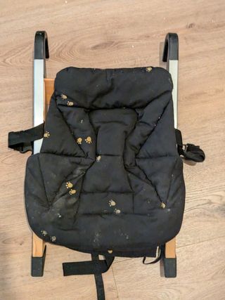 Preciosa trona de viaje HandySitt Stoke, ideal para llevar a cualquier parte. Se encuentra en perfecto estado. - Estructura de madera. - Arnés de seguridad. - Fácil de plegar y transportar.