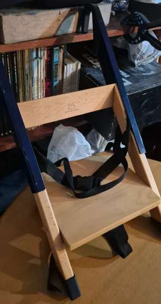 Preciosa trona plegable Handysitt de Stokke, ideal para ahorrar espacio. Se encuentra en perfecto estado. - Plegable para facilitar su almacenamiento. - Diseño compacto y ligero. - Estructura de madera y plástico resistente. - Se adapta a diferentes alturas de silla pq tiene brazos de agarre regulables - Posee una cincha inferior que asegura la trona a la silla sobre la que se pone. Para nosotros fue una gran adquisición!! Súper útil 👌