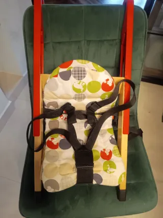 Trona plegable muy bien conservada, fabricada en madera de abedul y acero. Arnes de 3 puntos, soporta hasta 40 kilos y se adapta a sillas con respaldo de altura de 30 a 45 cm y un ancho superior a 34 cm. Muy práctica gracias a su estructura minimalista y la facilidad con la que se limpia. Está recomendada para bebés y niños, desde los 6 meses hasta los 5 años. Funda de transporte y asiento acolchado incluido.
