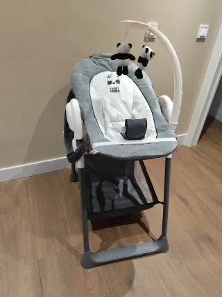 Trona evolutiva de la marca Hauck, diseñada para acompañar el crecimiento del bebé. - Diseño moderno con estampado de pandas. - Incluye arco de juegos con peluches. - Arnés de seguridad. - Reposapiés. Venta en persona Bilbao-Santsnder alrededores